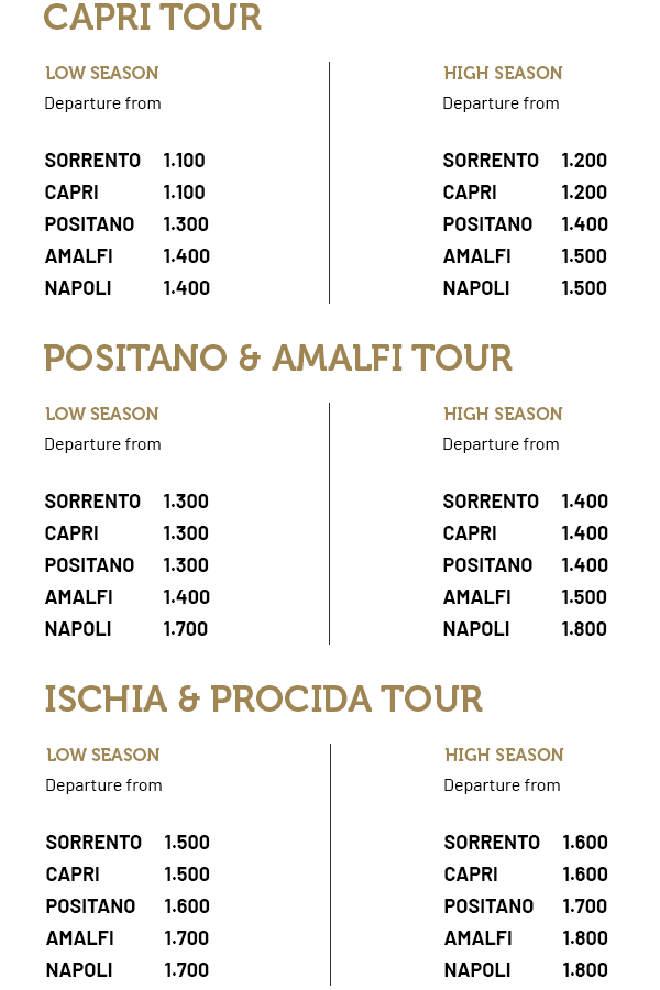 *El servicio no incluye el impuesto a pagar en los diferentes puertos (Capri 100€, Sorrento 35€, Napoli 60€, Ischia 35€ y Procida 15€), la entrada a la Gruta Azul (18€ por persona) y la Gruta Esmeralda (6€ por persona), servicio de recogida en alojamientos y puntos de referencia (10€ por persona).