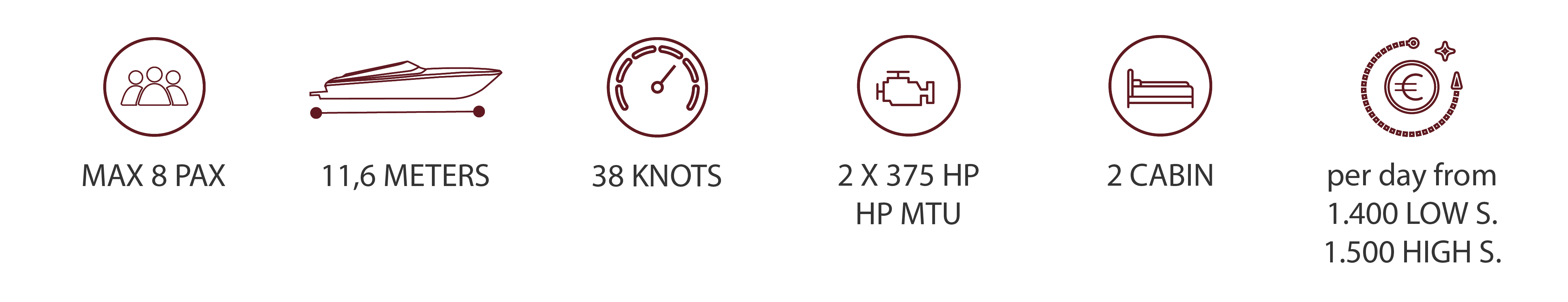 Nuestro Itama 38 ha sido completamente restaurado en 2017, siguiendo la tendencia de la moderna Itama 40. Es una de las lanchas a motor más solicitadas para mini-cruceros entre Capri y la Costa Amalfitana , equipada con todas las comodidades: cabina principal, comedor, baño, cocina, ducha fría y caliente, equipo de música, tv, aire acondicionado, nevera interna, hielera.